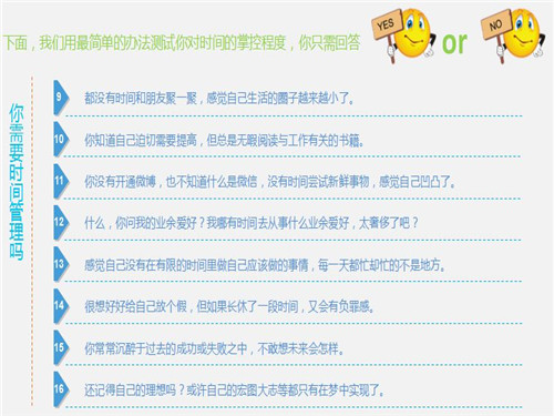 培訓(xùn)從一場(chǎng)有趣的時(shí)間管理測(cè)試展開,通過有趣的問答讓大家快速進(jìn)入情境,加深對(duì)培訓(xùn)必要性的認(rèn)知。時(shí)間和才華是我們一生擁有的兩大財(cái)富,但若是隨著時(shí)間的流逝,我們的才華并沒有增加,這就是虛度了時(shí)光。只有我們妥善安排并利用好時(shí)間,通過實(shí)現(xiàn)人生旅途中一個(gè)個(gè)小目標(biāo),才能最終實(shí)現(xiàn)自己的人生大目標(biāo),實(shí)現(xiàn)規(guī)劃中的理想生活。