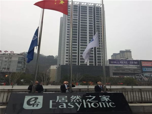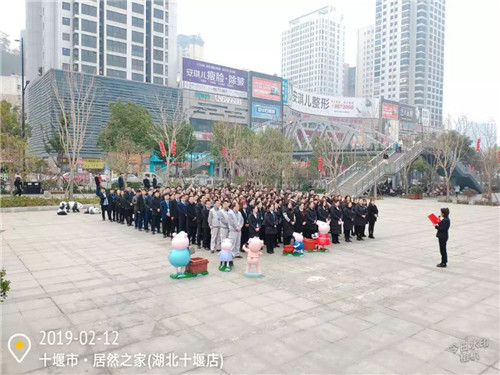 居然之家十堰店全體員工、商戶及銷售顧問聚集在六號(hào)廳門外,舉行新年升國旗儀式,以飽滿的熱情喜迎“2019年,開門紅”。